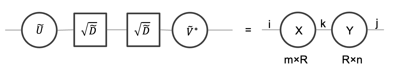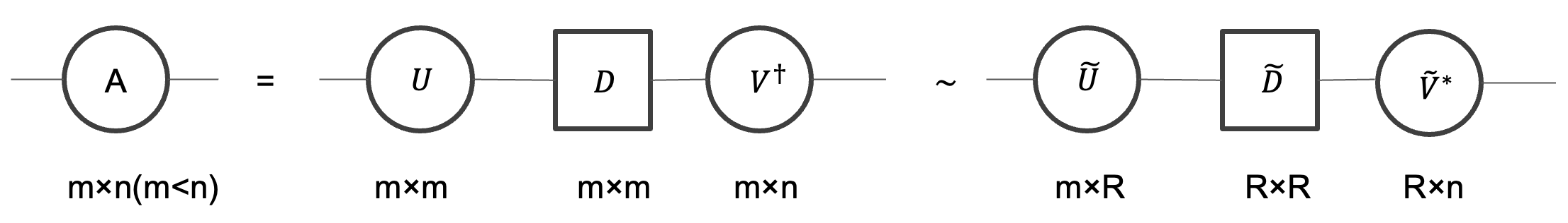 特異値分解をテンソルネットワークのダイアグラム表記すると以下のようになる。